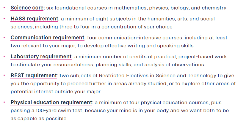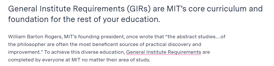 那么大一需要选修通识教育的课程并达到相应要求(General Institute Requirements GIRs),同时在此期间探索自己的学科兴趣。这个GIRs就是麻省理工学院的核心课程,是本科生后面几年教育的基础。