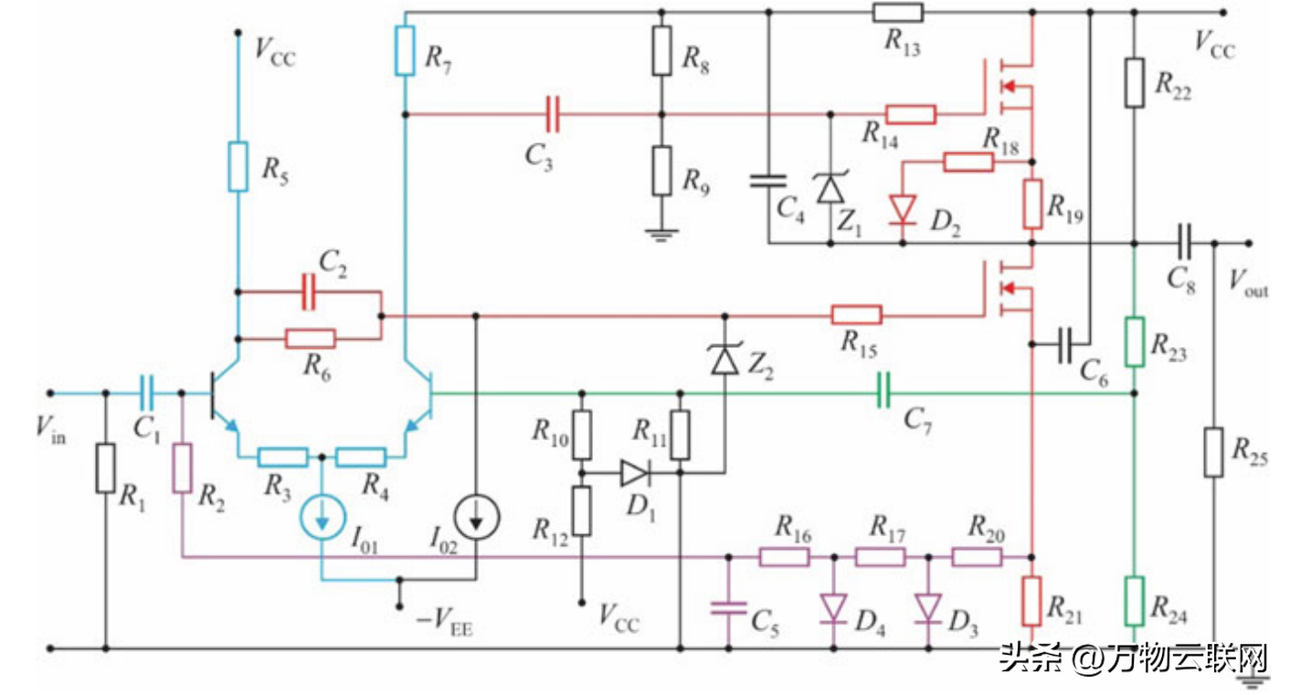 离散式NMOS功率晶体管输出级的AB类功率放大器的原理图