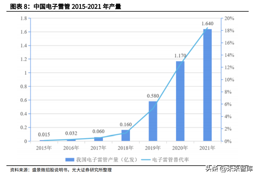 在政策的大力支持下,电子雷管市场迎来快速增长,相应推动了爆破专用电 子控制模块市场的快速增长。2018 年以来,电子雷管产量从 2018 年的 0.16 亿 发增长至 2021 年的 1.64 亿发,平均年化复合增长率为 117.22%;电子雷管替 代率(电子雷管产量/工业雷管总产量)逐年上升,从 2018 年的 1.28%提升至 2021 年的 18.43%,尽管电子雷管替代率提升较快,但距离政策要求的 100%替 代率差距仍然较大,爆破专用电子控制模块及电子雷管的市场空间较为广阔。