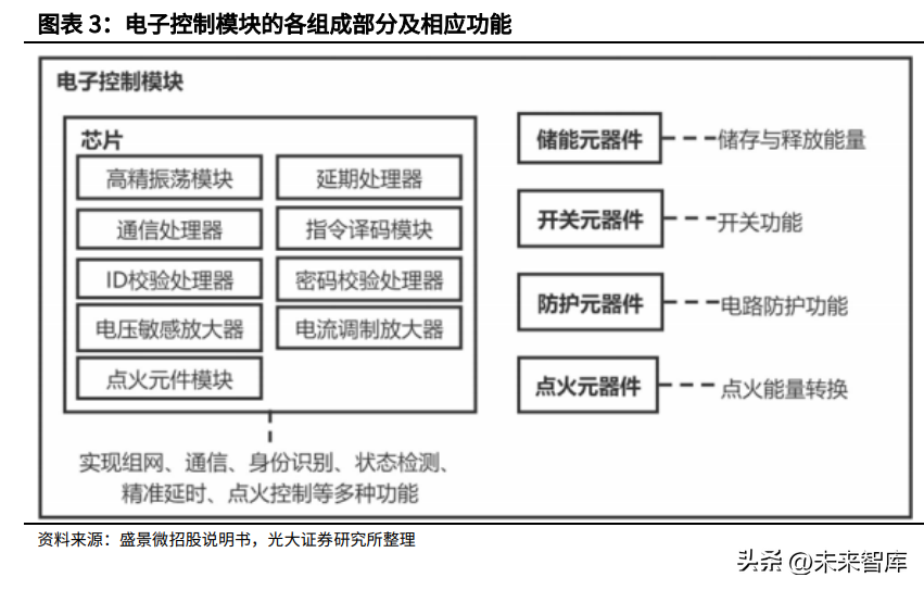 电子控制模块是电子雷管的核心组件,电子雷管通过电子控制模块实现可靠 通信、身份识别、状态检测、精准延时、起爆控制等关键功能。同时,电子控制 模块能够内置密码和身份码,使得电子雷管起爆系统具有安全管控功能,行业主 管部门已建立电子雷管的安全管控机制,能够实现电子雷管在生产、存储、流通 和使用各环节的闭环管控,特别是通过密码与授权控制起爆的功能有效杜绝了涉 爆危险品的非法使用,有利于提高社会公共安全水平。 典型的电子控制模块主要由芯片、储能元器件、开关元器件、防护元器件及 点火元器件组成。电子控制模块获取起爆控制器提供的电源,可执行身份识别、 在线检测、授时延时、起爆控制等多种指令。起爆时,芯片接收到指令并通过身 份识别后,按照指令进行高精度延期,延期结束后控制电子开关导通,储能元器 件的能量通过开关元器件释放至点火元器件上完成电子雷管起爆。
