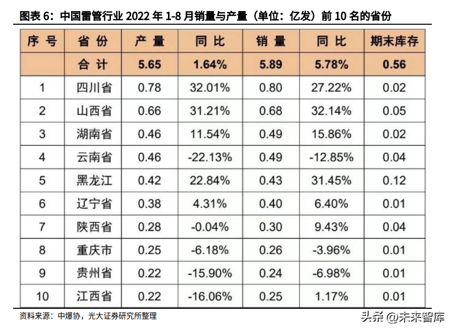 2021 年中国雷管需求大省包括四川、云南、山西、湖南、辽宁等省份,21 年销量分别为 1.04、0.89、0.85、0.65 和 0.59 亿发。 2022 年 1-8 月中国雷管需求大省包括四川、山西、湖南、云南、黑龙江、 辽宁等省份。