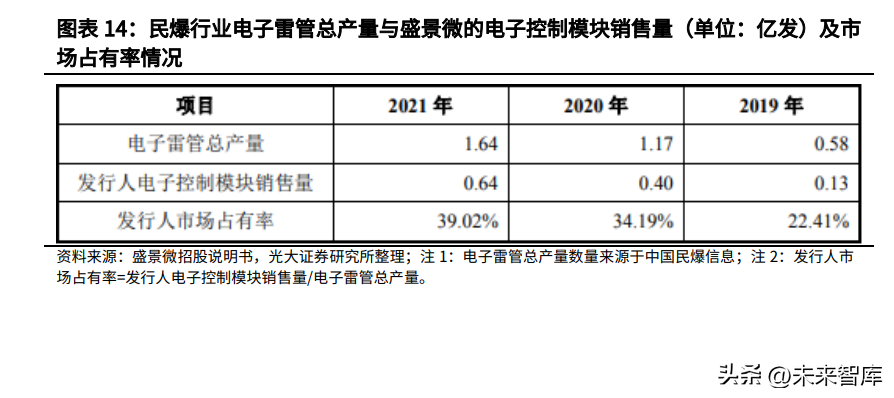 在爆破领域,电子控制模块作为电子雷管的核心组件,每发电子雷管必须配 备一个电子控制模块。 电子控制模块细分行业在国内发展历程相对较短,自 2006 年三峡大坝首次 应用电子雷管爆破后,国内企业着手研发和推广电子控制模块,至 2018 年国家 大力推广电子雷管开始,爆破专用电子控制模块市场逐步迎来快速增长,并在地 质勘探、石油开采、消防弹等领域逐步拓展应用。2018 年以来,部分业内企业 在专用集成电路设计、抗冲击与干扰、大规模组网等技术上实现突破,产品在爆 破领域率先打开局面。