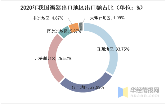 从出口目的地来看,2020年亚洲地区是我国衡器产品主要出口市场,共出口到亚洲地区金额为6.44亿美元,占比出口总额33.75%。欧洲地区是我国衡器产品出口第二大市场,共出口到欧洲地区金额为5.34亿美元,占比出口总额27.99%;其次是北美洲地区,共出口到北美洲地区金额为4.87亿美元,占比出口总额25.52%;南美洲地区、非洲地区与大洋洲地区出口额分别占比5.87%、4.87%与1.99%。
