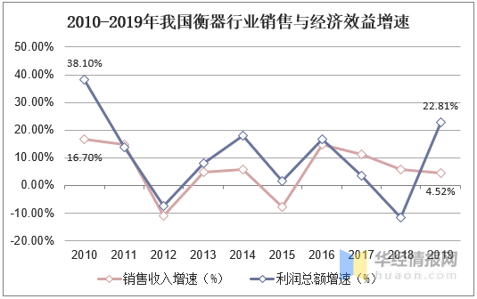 从衡器行业销售与经济效益增速来看,截至2019年我国衡器行业销售收入同比增长4.52%,利润总额同比增长22.81%。