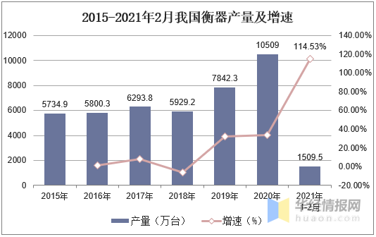 衡器是我国经济贸易发展领域重要的计量工具,衡器计量对市场经济贸易起到公平的交易职能,对我国的经济贸易发展具有重要意义,据统计,2020年我国衡器产量达到10509万台,同比增长34%,截至2021年1-2月产量为1509.5万台,同比增长114.53%。