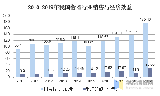 中国的衡器计量发展历程十分漫长,一直到春秋战国时期才有了统一的计量单位以及测量方法。到如今的信息时代,衡器计量已经不再仅仅局限于交易领域,还渗透到工程监管,数据计算等重要领域。根据中国衡器协会数据显示,2010-2019年我国衡器行业销售收入具有一定的波动性,但整体呈增长趋势,截至2019年实现销售收入175.46亿元;利润总额为28.66亿元。