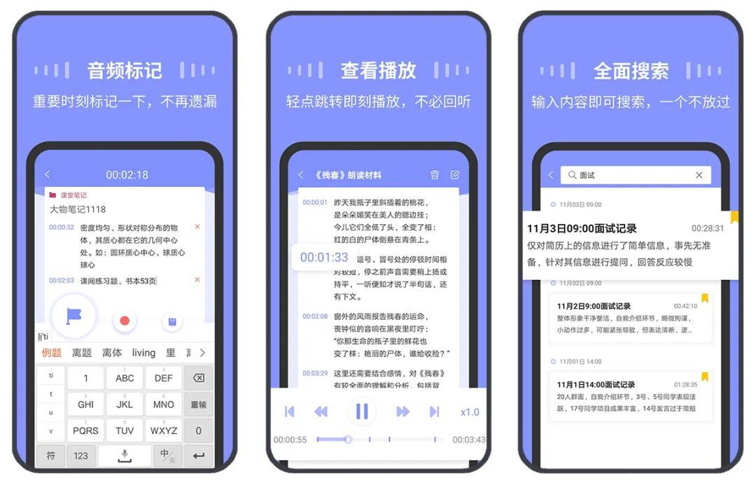 界面设计美观合理,功能简单实用,你可以对录音进行文字标记、分类管理、倍速播放、导出分享等。