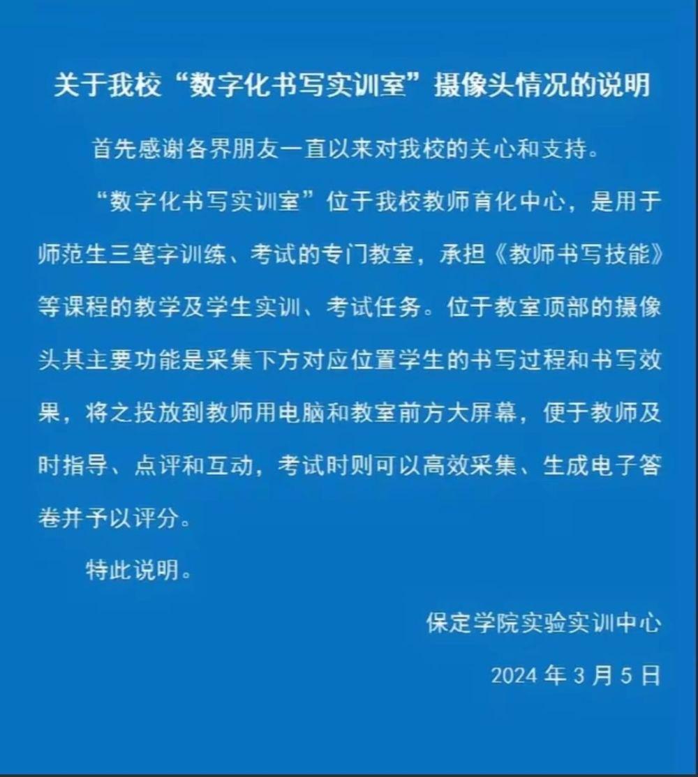 3月6日,保定学院再发通报回应,称上述教室是校方“数字化书写实训室”。