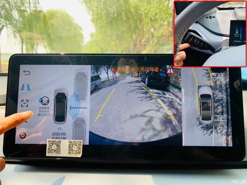第三步,低速向前继续行驶,这个时候车辆会自动检测车位,当达到适合进行自动泊车的位置,中控屏上会出现停车的提示,此时一定要将刹车踩到底将车辆停稳。