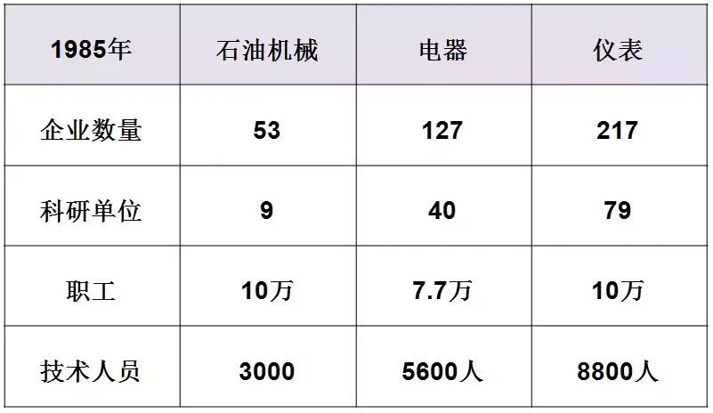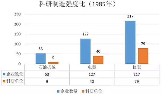 这其实并不是孤例。截止到1985年10月,当时的石油机械制造厂,有53个(60%的分布在一机部),而石油机械研究所则带有9个。也就是每10个公司就有2个院所作为支撑。当时石油机械工厂员工10万多人,而研究院所职工约3000人。科研制造人员强度为3%,每百人制造就有三人在从事大院大所的工作。这些密集分布的院所与制造工厂的比例,飞速推动了当时技术创新的发展。同样机械部归口的13大类仪器仪表行业,也有79个科研设计单位。而科研制造人员强度,则高达9%。