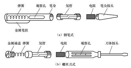 试电笔由笔尖金属体、电阻、氖管、笔身、小窗、弹簧和笔尾的金属体组成。