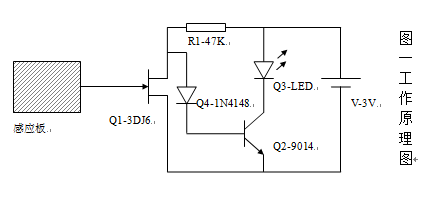 当电路处于常态时,Q1因栅极悬空形成漏电流,Q2基极无电流流入,Q3处于熄灭状态。当感应板靠近220V或以上的交变电源时,因电源在四周将形成一交变电场,感应板上将感应出相应交变电压加到Q1栅极,感应板上感应电压为负时,Q1截止,V电压经过R1、Q4加至Q2基极,Q2导通,Q3发光。