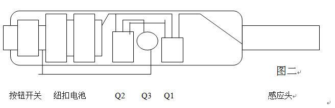 因本电路及为简单,因此不需要电路板,直接用元件塔焊即可。Q1选用3DJ6场效应管,LED选用高亮度红色发光二极管。在焊接前应注意,Q1必须用铜丝将各引脚短路后才可进行焊接工作,以防被静电损坏。全部电路焊接完全后才可拆去短路线工作,V选用RC3纽扣电池,外壳可使用普通试电笔外壳改制。组装示意图如图二所示: