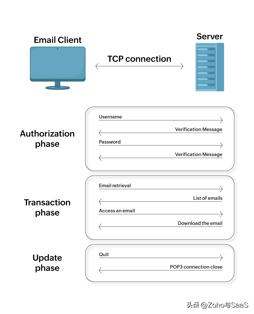 POP3通过建立与电子邮件服务器的传输控制协议(TCP)连接来检索邮件。一旦TCP连接建立,POP3进行三个阶段的操作:授权阶段、事务阶段和更新阶段。