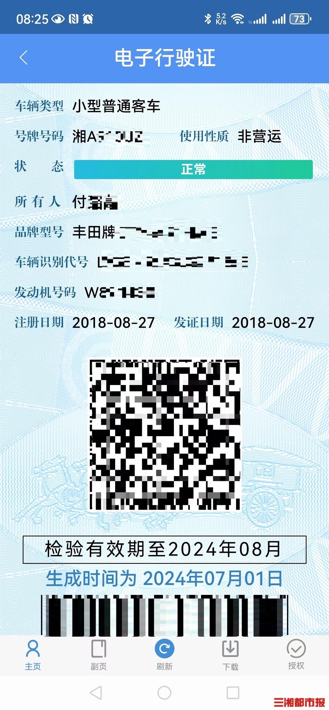 上午8时,付先生看到三湘都市报电子行驶证相关报道后,抱着试一试的心态点开了 “交管12123”APP。“原本以为会像上次电子驾驶证申领一样遇到网络拥堵,没想到非常顺畅,全程不到1分钟。”付先生表示,他点开APP后,系统提示他需要更新版本,点击“立即更新”后再进入,首页就出现了电子证件凭证选项。点进该选项,付先生名下两台车都显示可以申领电子行驶证。两台车分别点击申领后,系统提示提交成功,将在1个工作日内通知受理结果。付先生几分钟后再来查询,就显示“已申领”,点开就能看到电子行驶证。