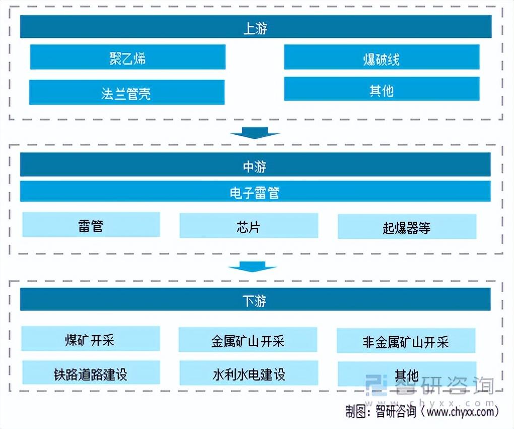 电子雷管产业链明晰,上游可以延伸到聚乙烯、爆破线、法兰管壳等原材料,电子雷管产业链中游包括雷管所用的芯片、起爆器等核心零件和电子雷管,产业链下游应用领域广泛,主要集中在矿山开采、铁路道路建设和水利水电建设中去。