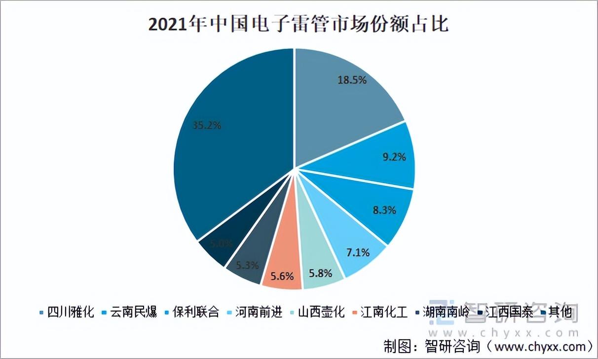 从我国电子雷管产量来看,2021年雅化集团、云南民爆、保利联合、河南前进、山西壶化、江南化工、湖南南岭、江西国泰的电子雷管产销量较多。四川雅化电子雷管市场份额占比18.5%位居第一。