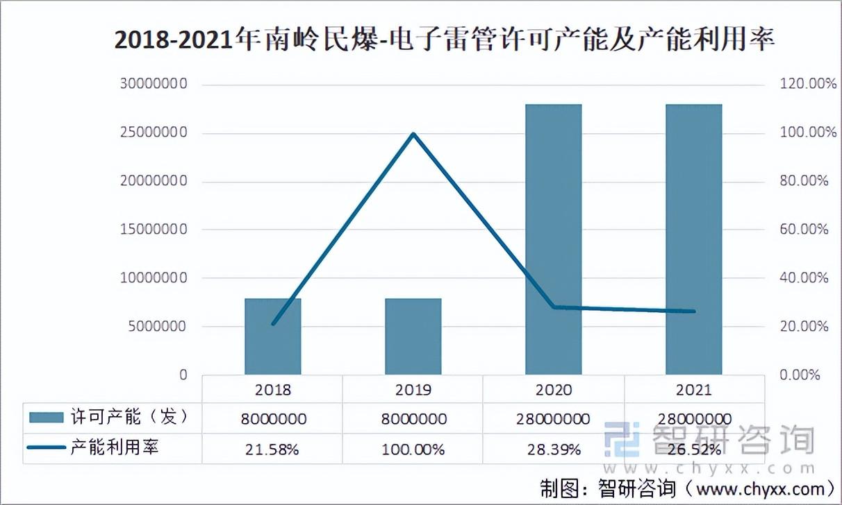 湖南南岭民用爆破器材股份有限公司是我国民爆行业第3家上市的公司,湖南省首家军工民爆上市公司,中国中小板上市公司五十强之一。其中2021年南岭民爆-电子雷管许可产能为28000000发;产能利用率为26.52%。