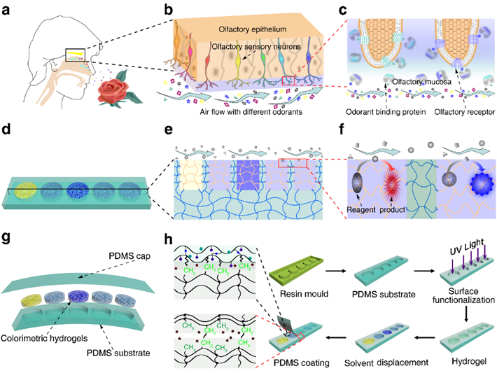 图1 (a-c)自然嗅觉系统识别气味过程机理图;(d-f)比色人工嗅觉系统总图及其检测过程图;(g-h)比色人工嗅觉系统分解图及其制备过程图