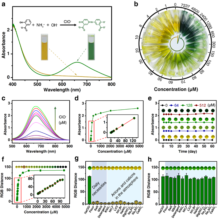 图2(a)比色试剂检测1 mM的NaClO前后紫外-可见吸收光谱对比图,插图为比色皿中试剂颜色对比图片及其反应机理图;(b-d)随NaClO浓度增加试剂的颜色变化过程图,紫外-可见吸收光谱变化图,666 nm位置处吸收值变化图及其拟合曲线插图;(e)试剂在60天内检测不同浓度NaClO的666 nm位置处紫外-可见吸收峰值变化图及其实物照片;(f)试剂检测不同浓度NaClO的RGB距离变化图及其拟合曲线插图;(g-h)RGB距离分析试剂对于日常用品及其空气中水溶性悬浮离子的选择性和抗干扰性能,插图为其相应的实物照片(图中的标准偏差均为3次测试后的计算结果)