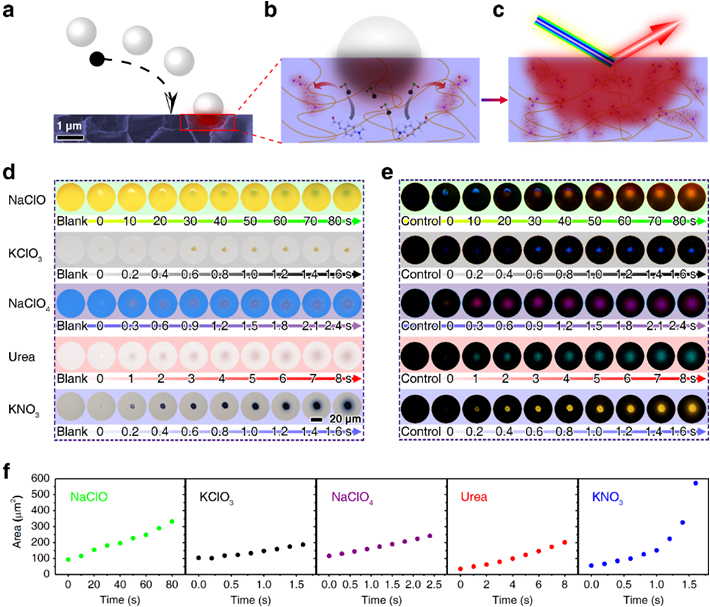 图4 (a-c)比色水凝胶检测颗粒过程示意图;比色水凝胶检测5种非制式爆炸物悬浮颗粒的(d)时间序列图,(e)差色图,(f)颜色扩散面积随时间的变化图