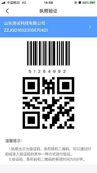 1.扫码企业出示的电子营业执照条形码、二维码。