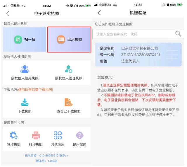 1.亮照。持照人点击“出示执照”,选择要出示的电子营业执照,输入执照密码并验证通过后即可展示其合法持有的电子营业执照。