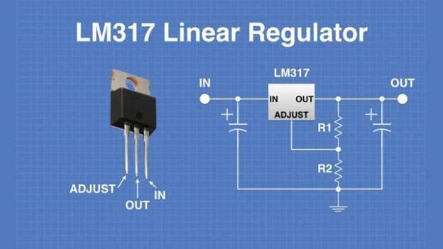 与78XX系列或稳压器一样,LM317是三引脚器件。但是,接线略有不同,如此处所示。