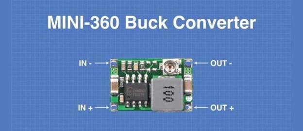 现在让我们看一下降压转换器。MINI-360是一款超小型,超高效的降压转换器,可以接受高达23伏的输入,并提供可调节至低至1伏和高至17伏的输出。