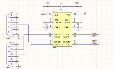 双路232通信电路:3线连接方式,对应的是母头,工作电压5V,可以使用MAX202或MAX232。