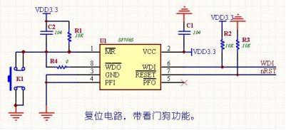 SP706S复位电路:带看门狗和手动复位,价格便宜(美信的贵很多),R4为调试用,调试完后焊接好R4。