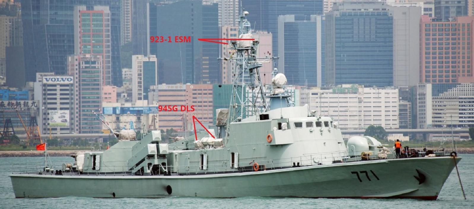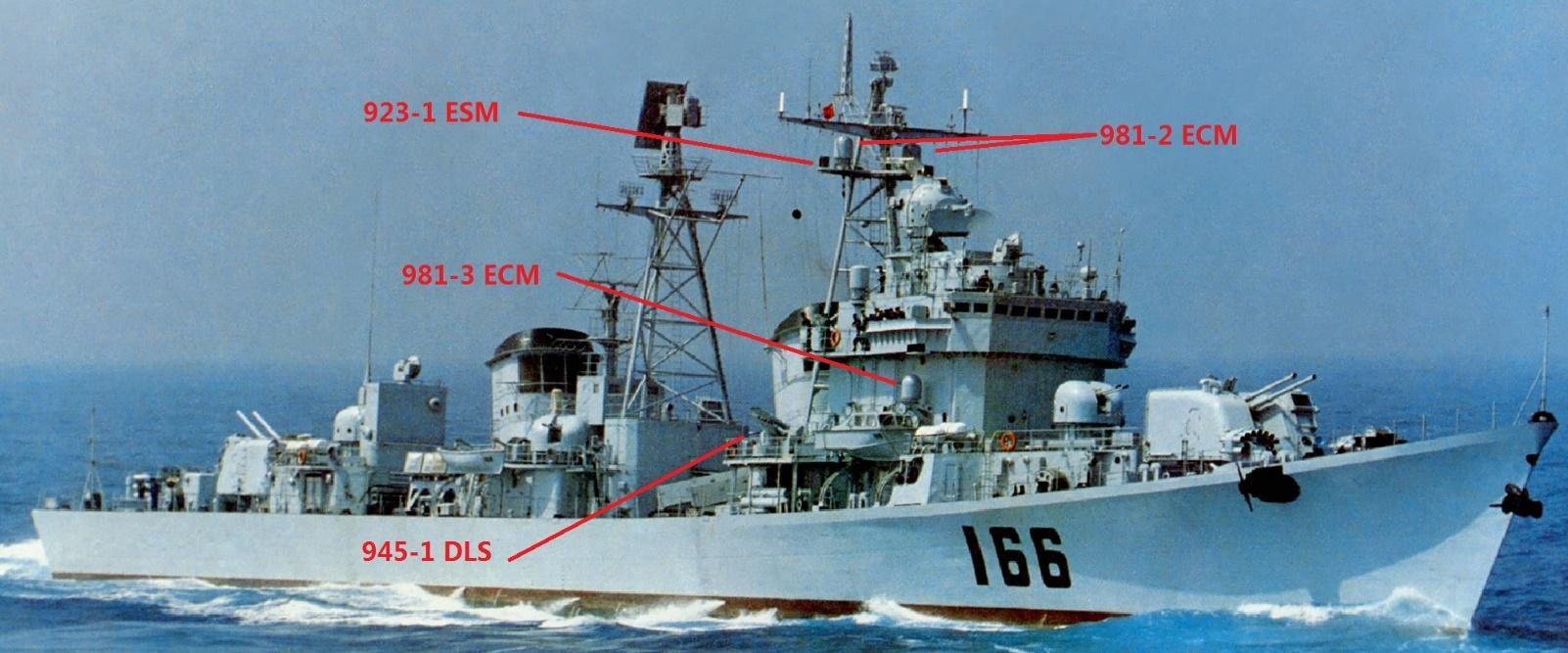 825系列电子战系统:是由923-1雷达侦察机,981-2雷达欺骗干扰机,981-3雷达杂波干扰机,以及945-1无源干扰发射器组成,主要装备053早期型号护卫舰以及部分051G驱逐舰。80年代初期,为满足装备053新护卫舰的电子战的需求,我国开始论证研制825系列舰载电子对抗系统。在此之前,我国没有完整的舰载电子对抗系统,825系列电子战系统中各分系统的研制配套成功,开创了我国舰载电子战系统化的先河。825系列在研制过程中,不仅满足了053护卫舰的需求,还进一步满足051G驱逐舰的使用要求,同时通过简化组合满足了037II导弹艇的需求。在装备我国海军舰艇的同时,还成功的作为053HT护卫舰的配套设备出口到泰国海军。