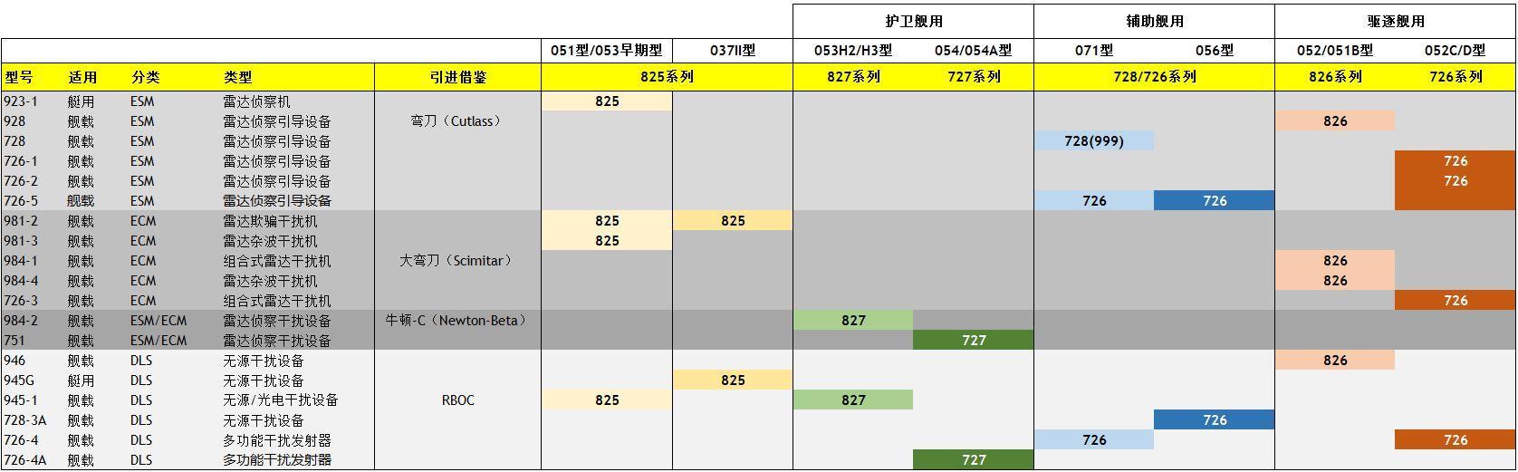 826系列电子战系统:由928雷达侦察机,984-1组合式雷达干扰机,984-4雷达杂波干扰机,以及946无源干扰发射器组成,主要装备052驱逐舰。,我国相关科研单位于80年代初开始研制826舰载电子对抗系统,826舰载电子对抗系统是为大型水面舰艇研制配套的。同样的,在研制过程中该系统部分参考英国“弯刀” (Cutlass Family ESM System)系列电子战侦察系统和以及“大弯刀” (Scimitar Jammer)电子干扰机。其中“弯刀” 系列电子战侦察系统是整合了DESM的解决方案,属于当时先进的瞬间测频(IMF)设备。928雷达侦察机在借鉴过程中对该系统又进行了大量的改进性研制,使928雷达侦察机在工作性能,处理速度和系统稳定性上又提高了一个台阶。同样的,984-1组合式雷达干扰机也在性能上超过了“大弯刀”电子干扰机。由于826系列电子战系统的研制周期较长,同时现役舰艇可改装的余地较小,所以只在052驱逐舰上安装。很快在后续舰艇上被更为先进的726系列电子战系统所替代。