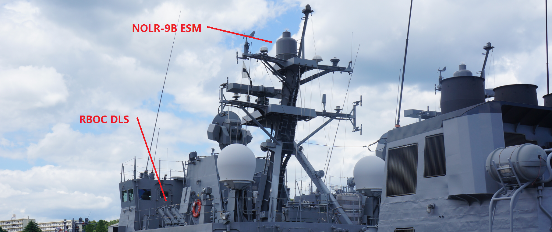 这种由雷达侦察支援系统配合无源干扰发射器的组合在世界海军舰艇中也比较常见,比如日本海上自卫队的隼级导弹艇,它就是由桅杆顶端的NOLR-9B雷达侦察/支援系统,配合舰桥两侧的RBOC无源干扰发射器来实现低烈度对抗条件下的电子对抗能力。
