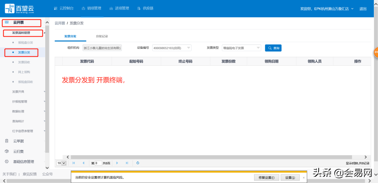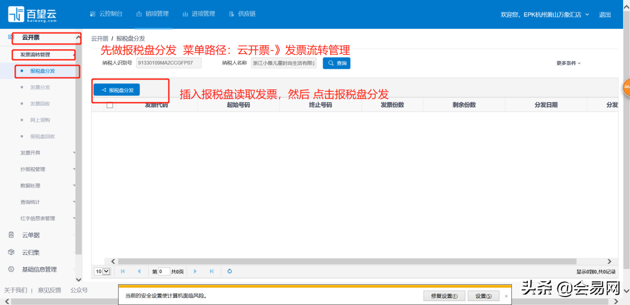 3、依次点击“云开票”—“发票流转管理”—“报税盘分发”。如下图所示: