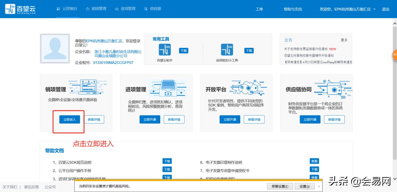 2、登录百望云系统,点击销项管理项目中的“立即进入”,如下图所示: