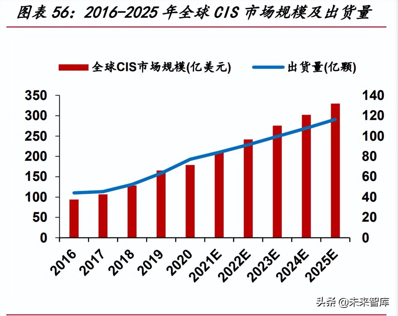 得益于多摄手机的广泛普及和安防监控、智能车载摄像头和机器视觉的快速发 展。CIS 整体出货量及销售额不断扩大,根据 Frost&Sullivan 数据,2025 年全球 CIS 出货量将可达 116.4 亿颗,5 年 CAGR 为 8.5%;全球 CIS 销售额将达到 330 亿美元, 5 年 CAGR 为 11.9%: