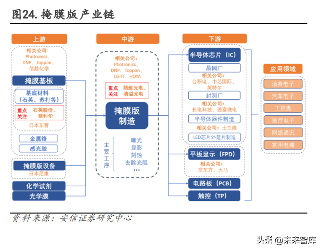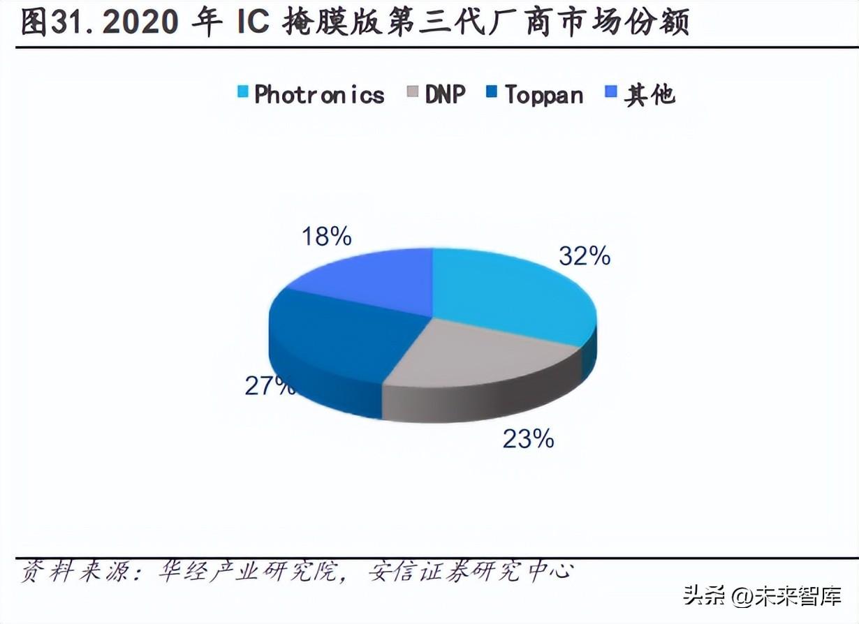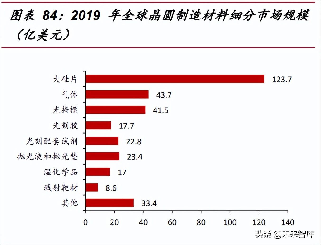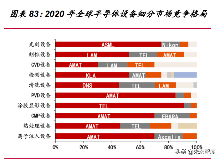 半导体设备、材料是半导体产业链发展的支撑,替代空间十分广阔。从市场规 模来看,光刻设备、刻蚀设备和薄膜沉积设备是主要前道设备,2020 年全球市场规 模分别为 134.3 亿美元、124.1 亿美元、117.8 亿美元;半导体材料中硅材料、电子 气体、掩膜、光刻胶及其配套试剂是占比前四的晶圆制造材料,2019 年全球市场规 模分别为 123.7 亿美元、43.7 亿美元、41.5 亿美元、40.5 亿美元。从竞争格局来看, 美、日、欧企业占据市场绝大部分份额:AMAT、ASML、LAM、TEL 几乎占据市场 70%的设备份额;材料细分领域较多,虽然没有被少数几个企业占据全部半导体材料 市场,但是细分领域内的 70%份额依旧被少数几个龙头占据,且企业以日本、美国 为主。综合空间、格局来看,我国设备、材料的替代空间十分广阔。