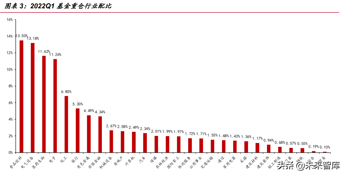 2022Q1 电子持仓市值占比 11.26%,排名下降至第 4 名(上季度排名第 2 名, 占比 14.18%)。排名电子行业前面的行业分别是食品饮料、电气设备、医药生物, 分别占比 13.50%、13.18%、11.62%。