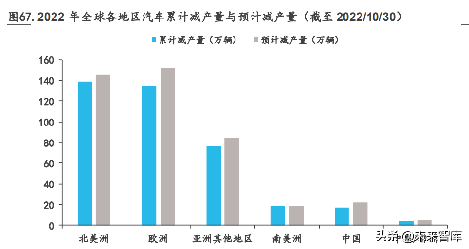 2021 年 1 月至 2022 年 10 月底缺芯导致全球汽车减产共 1410 万辆,预测 2023 年供给紧缺 持续,减产将超 300 万辆。根据 2021 年 AFS 统计报告,由于芯片短缺,2021 年全球汽车市 场累计减产量约为 1020 万辆。主要地区中,北美洲减产 317.8 万辆,欧洲减产 295.4 万辆, 中国减产 198.2 万辆,亚洲其他地区减产 174 万辆,南美洲减产 35.5 万辆,中东/非洲合计 减产 6.2 万辆。其中,亚洲是 2021 年汽车减产最严重的地区,合计减产超 360 万辆。针对 2022 年,AFS 曾经预计将减产 76.77 万辆,其中北美洲预计减产 17.43 万辆,欧洲预计减产 28.08 万辆,中国减产 10.82 万辆,亚洲其他地区减产 16.3 万辆,南美洲减产 3.14 万辆, 中东和非洲预计减产 1 万辆。并且 2022 年汽车产业“缺芯”情况尚未转好,截至 2022 年 10 月 30 日,全球因为缺芯已导致汽车产量缩减约 390.5 万辆。其中,欧洲地区遭受了巨大的冲 击,减产 135.14 万辆汽车;北美地区减产 138.65 万辆汽车;亚洲其他地区减产 76.46 万辆 汽车;中国地区减产 17.29 万辆汽车。AFS 预计到 2022 年底,全球累计减产量将达 427.8 万 辆,相较 9 月预估增加 1.62 万辆;2023 年减产量或超 300 万辆。