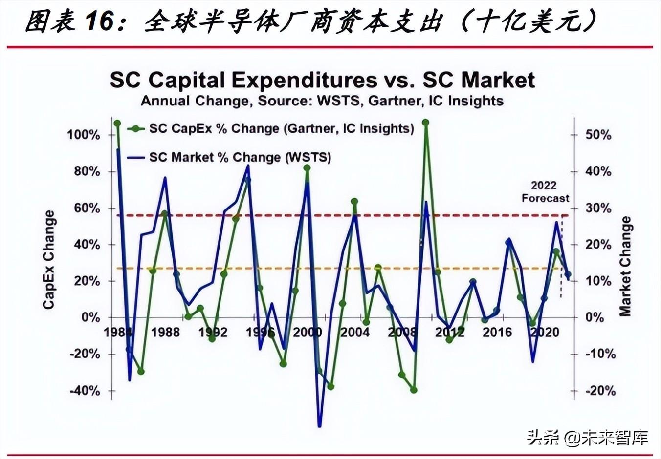 全球半导体厂商资本支出不断加大。根据 IC Insights 的数据,13 家公司计划 在 2022 年将资本支出比 2021 年增加 40%以上。2022 年最大的资本支出将来自台积电, 达到 420 亿美元,增长 40%,英特尔为 270 亿美元,增长 44%。IC Insights 预测, 半导体行业资本支出将在 2022 年增加 24%,达到 1904 亿美元的历史新高,这也是自 1993 年~1995 年以来,半导体行业首次出现连续三年的两位数支出增长。