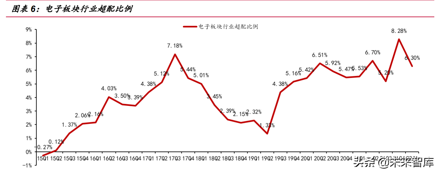 基金重仓股超配比例为 6.30%,冲高回落。截至 2022Q1,电子板块超配比例为 6.30%,环比下降 1.98 个百分点,继 2021Q4 创历史新高之后出现回落。