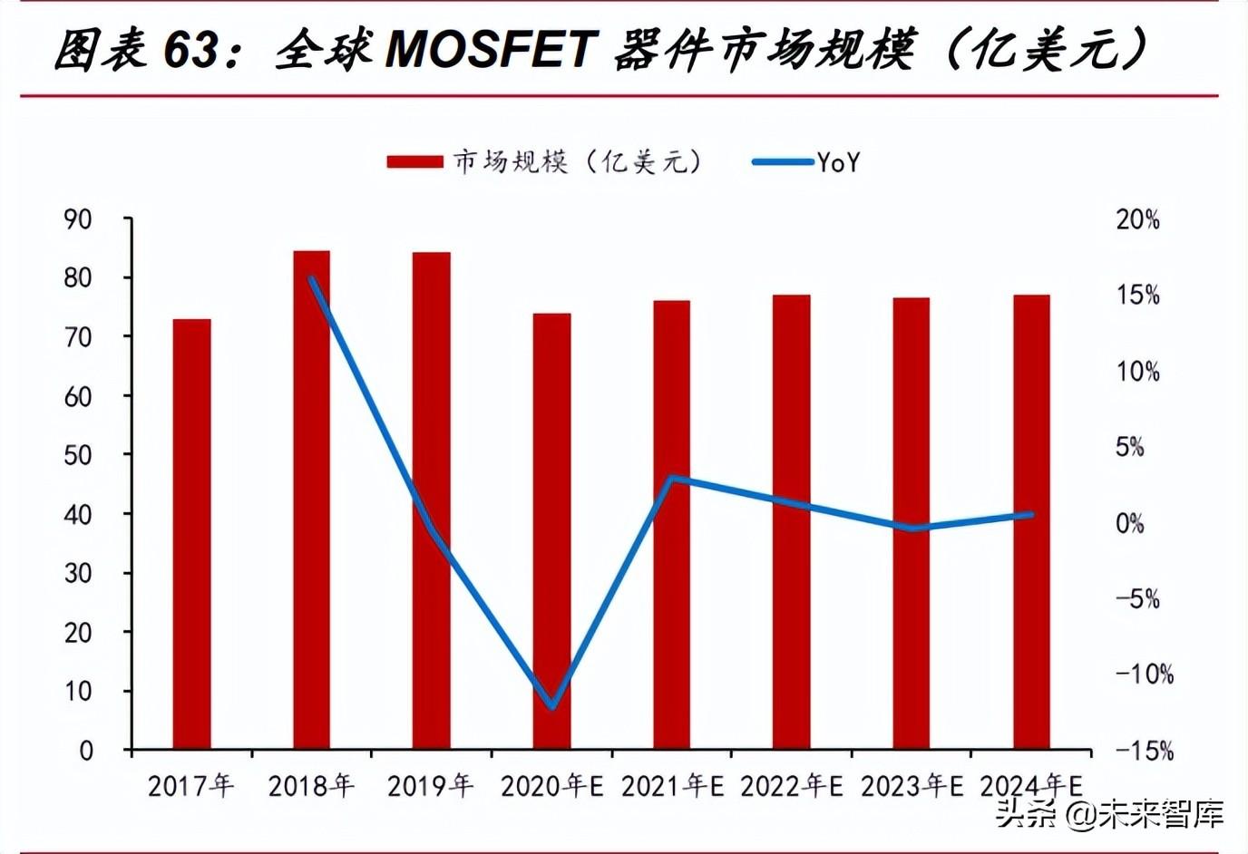 目前的功率器件以硅基的二极管/MOSFET/IGBT 等器件为主,其中 MOSFET 是最大的细分品类。全球 MOSFET 器件市场规模在 2019 年约为 84.20 亿美元,2020 年受疫情影响出现下滑,2024 年预计回升至 77.02 亿美元。中国 MOSFET 器件市 场规模在 2019 年约为 33.42 亿美元,占全球市场的 39.69%,2024 年约为 29.70 亿 美元。