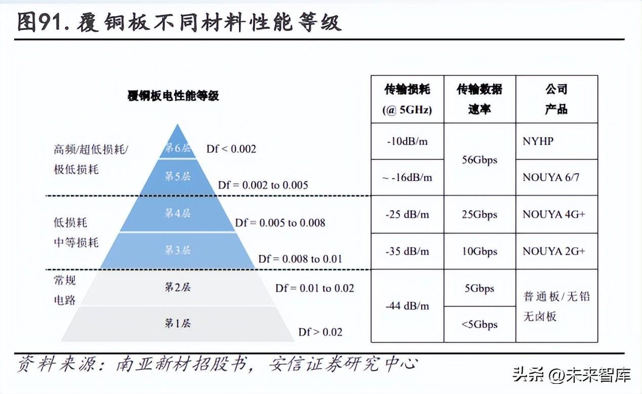 要求 PCB 板层数增加,CCL 材质损耗降低。PCB 主流板材为 8-16 层,对应 PCIe 3.0 一般为 8-12 层,4.0 为 12-16 层,而 5.0 平台则在 16 层以上。从材料的选择上来看,为衡量 CCL 性 能的主要指标有 Dk(介电常数)和 Df(损耗因子),低介电常数和低介质损耗因子可以满足 通信设备中信号穿透能力差、信号延迟的问题。业内根据 Df 将覆铜板分为六个等级,传输速 率越高对应需要的 Df 值越低,相应材料的技术难度越高。以理论传输速度为 10-20Gbps 的 5G 通信为例,对应覆铜板的介质损耗性能至少需达到中低损耗等级,而 PCIe 升级后服务器 对 CCL 的材料要求将达到高频/超低损耗/极低损耗级别。