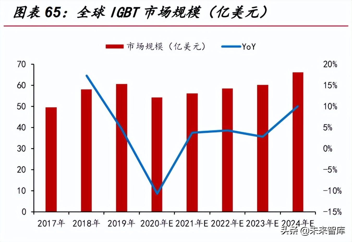 IGBT 市场规模低于 MOSFET,发展潜力较大。根据 Omdia 的统计和预测,全 球 IGBT 市场规模 2024 年预计达到 66.19亿美元,2020-2024 年复合增速约为5.16%; 中国 IGBT 市场规模 2024 年预计达到 25.76 亿美元,2020-2024 年复合增速约为 4.34%,中国市场占全球比例约为 40%左右。