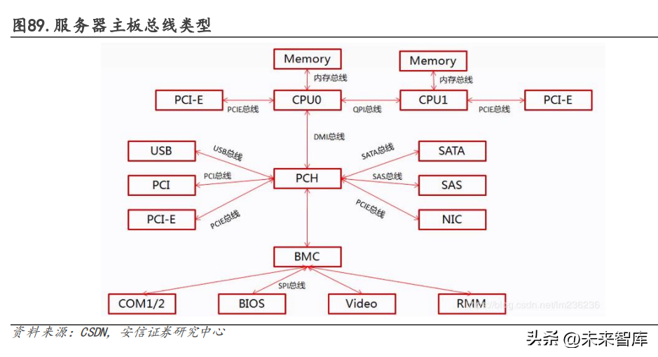 PCIe 脱胎于 PCI 架构,是服务器主流总线解决方案。PCIe 标准之前,PC 上的系统总线由 PCI 和 AGP 组成,AGP 主要用于连接显卡,是在 PCI 标准基础上针对 3D 应用拓展而来的,没有脱 离 PCI 体系,其他的各种外接设备如网卡、独立声卡等,都连接在 PCI 总线上,高度共享同 一带宽。随着新技术的不断发展,PCI 总线的传输能力逐渐力不从心。2001 年提出的 PCIe 标 准完全脱胎于 PCI 架构,采用点对点传输的串行方式,在时钟频率、传输带宽上具有明显优 势,并且可以在软件层面与 PCI 兼容。新兴总线标准层出不穷,但无法替代 PCIe 的主导地 位。