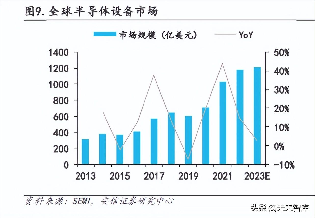 全球晶圆厂设备支出不断提高,设备厂商有望持续受益。根据 SEMI 数据,2022 年全球前端晶圆厂所需的半导体设备支出总金额较前一年增长 18%,达到了 1070 亿 美元的历史新高,继 2021 年增长 42%后连续三年大涨。另外,据 SEMI 预测,2023 年可望持续稳健成长,全球晶圆厂设备支出将保有千亿美元以上,相关设备厂商有望 充分受益。