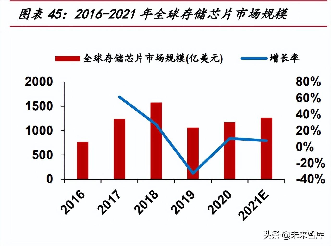存储市场逐渐回暖。根据 WSTS 数据,2018 年全球存储芯片市场规模达到峰值 1580 亿美元后逐步下行,但随着 AIoT 与下游汽车、工业、通信等领域的深度融合, 各领域智能化进程大幅增加了数据量,相应的提升了对于存储的需求,同时叠加“缺 芯”涨价潮和疫情好转,全球存储市场回暖。根据 IC Insights 数据,2021-2021 年 全球存储市场规模分别为 1552、1804 和 2196 亿美元,2021 年存储芯片分布为 DRAM(56%)、NAND Flash(41%)、NOR Flash(2%)。