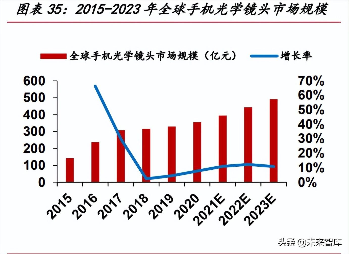 3)光学镜头与模组联动,带动模组量价齐升。光学镜头和手机摄像头模组位于 行业中游核心位置,手机摄像头模组由光学镜头、音圈马达、红外截止滤光片和图像 传感器等主要零部件组成。根据头豹研究院数据,全球手机光学镜头市场从 2015 年 142.6 亿元增长至 2020 年的 355.6 亿元,2015-2020 年 CAGR 为 20.05%,预计 2023 年市场规模为 491.6 亿元。根据 TSR 数据,全球智能手机摄像头模组市场从 2018 年 225 亿美元增长至 2020 年的 330 亿美元,2018-2020 年 CAGR 为 21.66%。作 为光学镜头的主要应用场景,智能手机将继续为光学镜头行业提供增量空间。