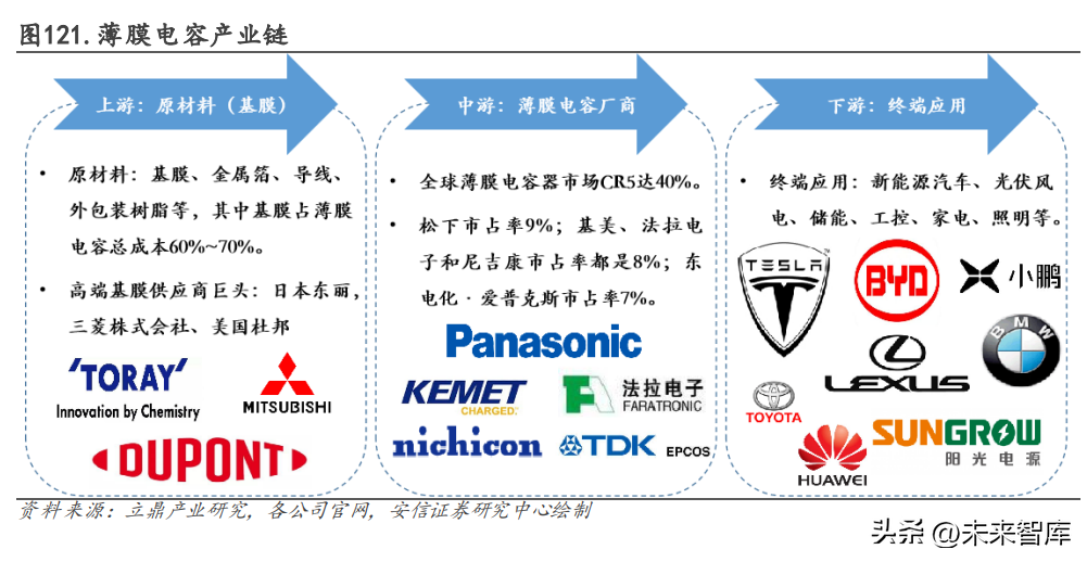 1)上游:金属化膜成本占比 60%,高端膜主要由日美供应。薄膜电容产业链上游为各种原材 料,包括基膜(金属化膜)、金属箔、导线、外包装树脂等。据江海股份在互易动披露,金属 化膜为薄膜电容的主要材料,其占成本约为 60%。传统的家电照明多采用 BOPET 薄膜(双向 拉伸聚酯薄膜),而高压大电流领域通常用 BOPP 薄膜(双向拉伸聚丙烯薄膜)。目前全球高端 薄膜电容基膜市场由日美主导,龙头企业包括日本东丽,美国杜邦和三菱化学。国内基膜供 应商有铜峰电子、航天彩虹、大东南、东材科技、嘉德利等,中游电容企业如法拉电子和江 海股份也已向上游拓展,提升金属化膜等原材料自供能力,从而有效保障供应链安全以及产 品质量水平。